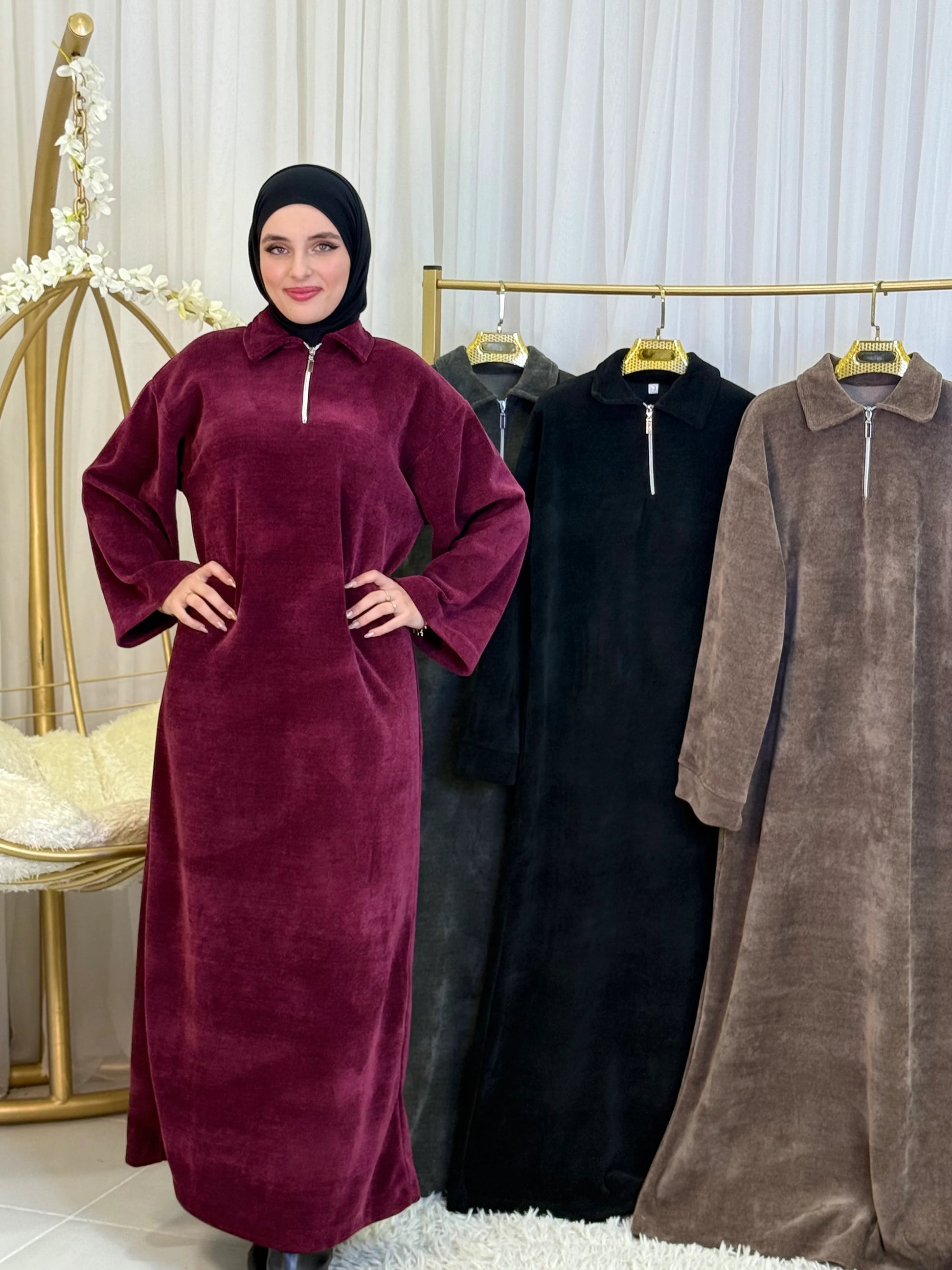 Robe d’hiver élégante confectionnée dans un tissu doux et chaud offrant un confort parfait durant les journées froides.